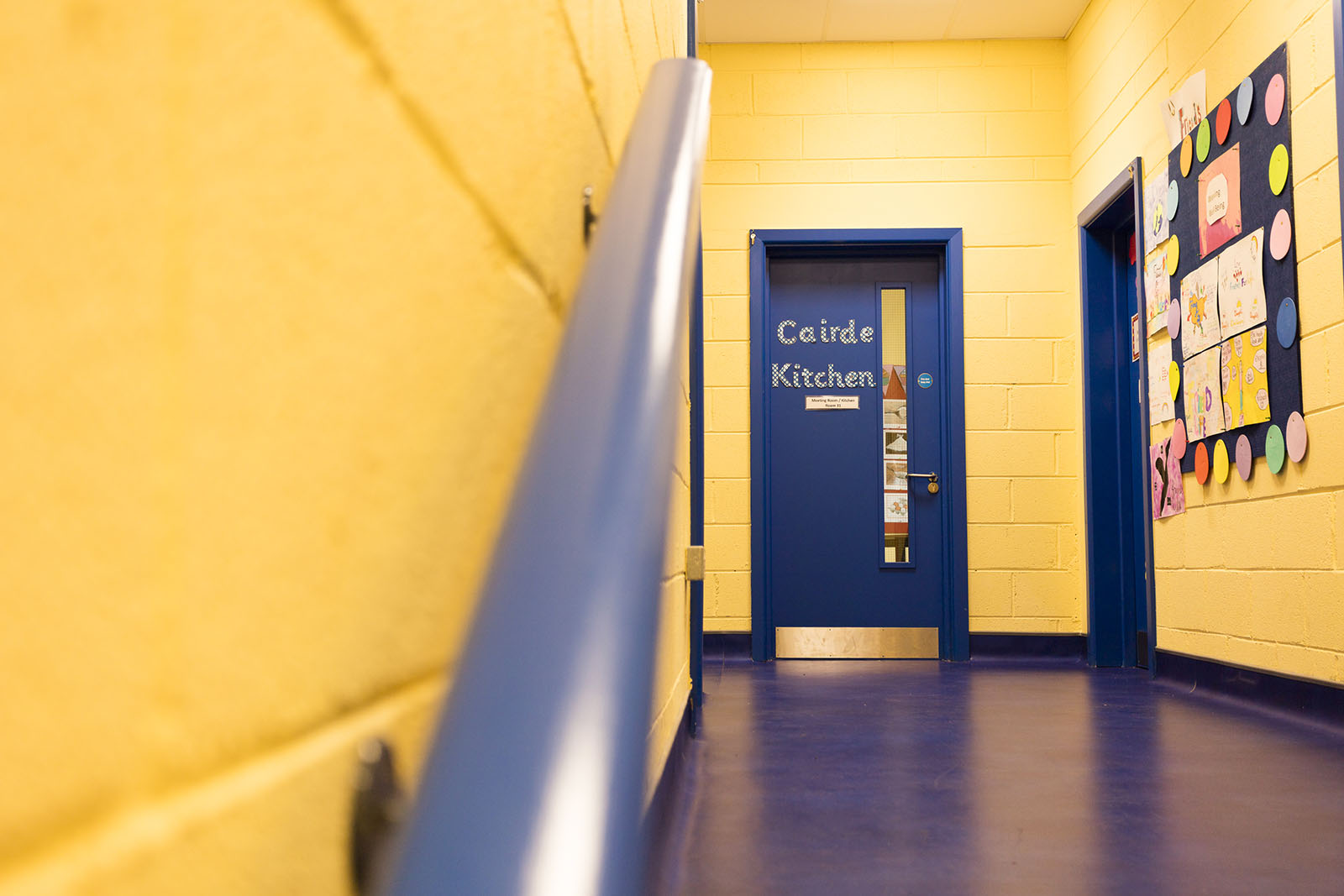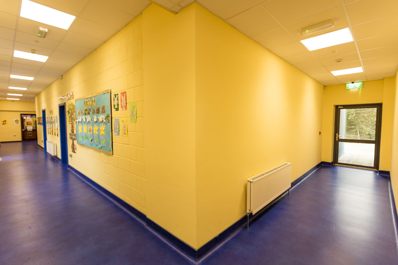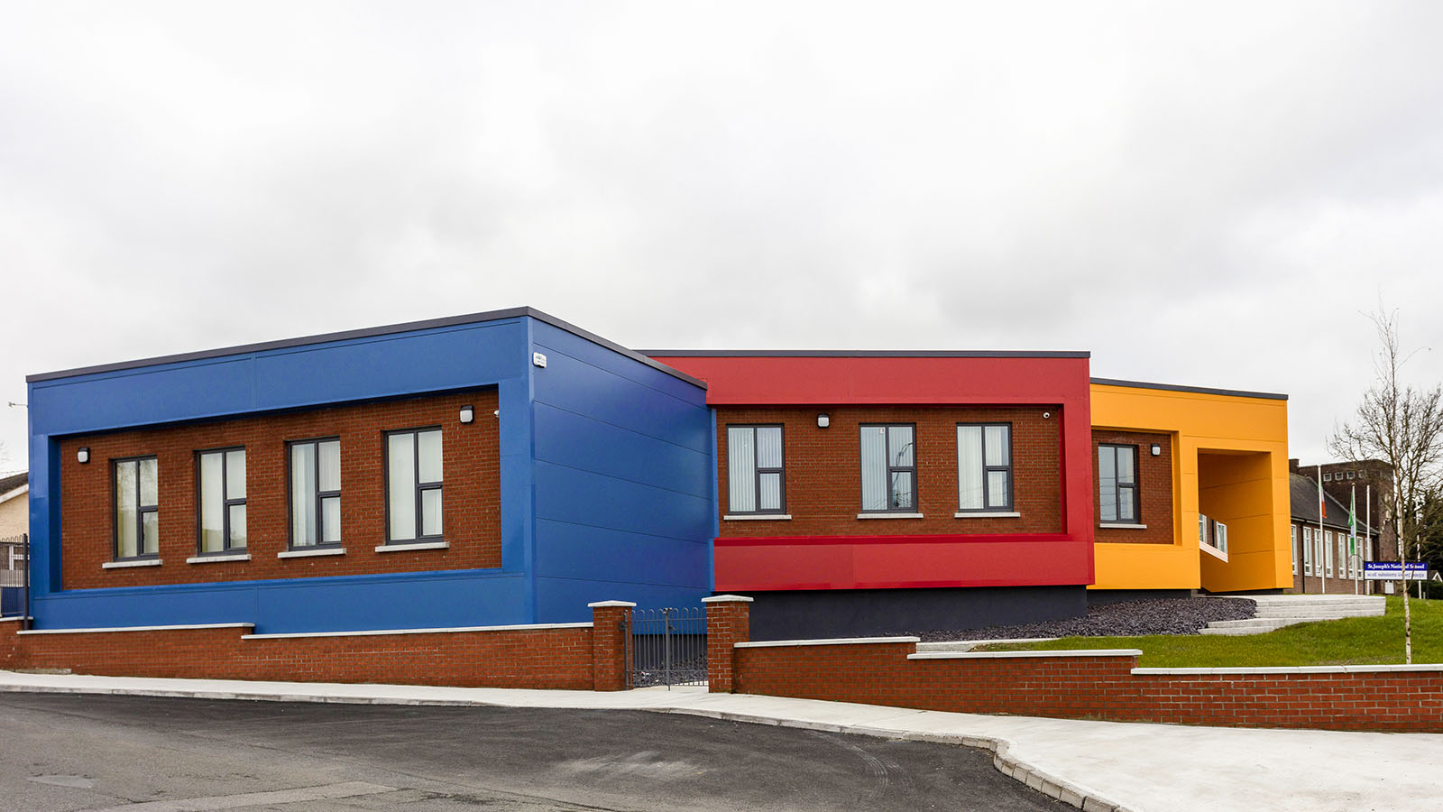 New ASD Unit contemporary extension to existing brick National School building. Playful use of colours and shapes were incorporated into this extension on what was a sloped and restricted site, to mimic the shapes and colours the pupils experience in the building on a daily basis.