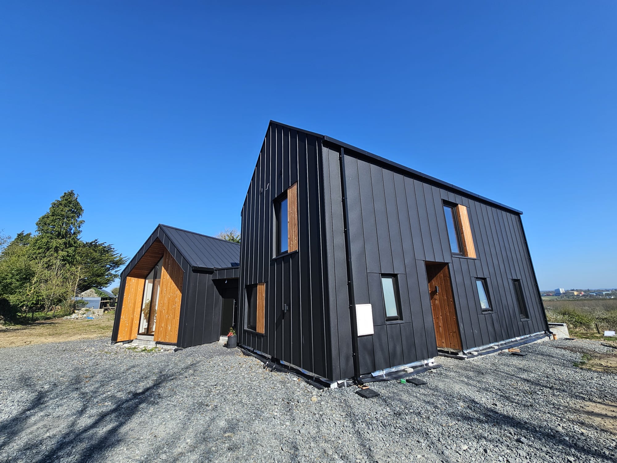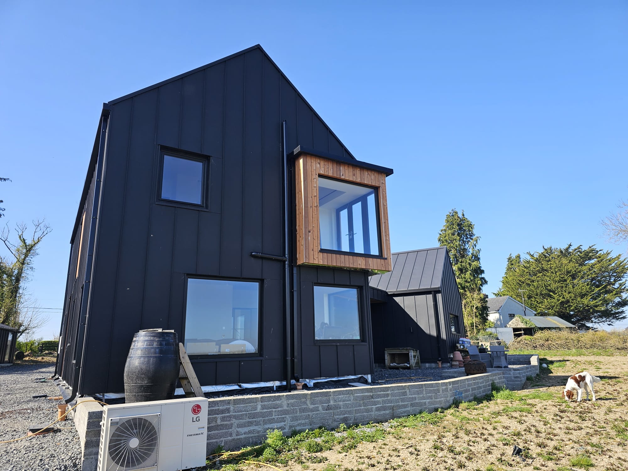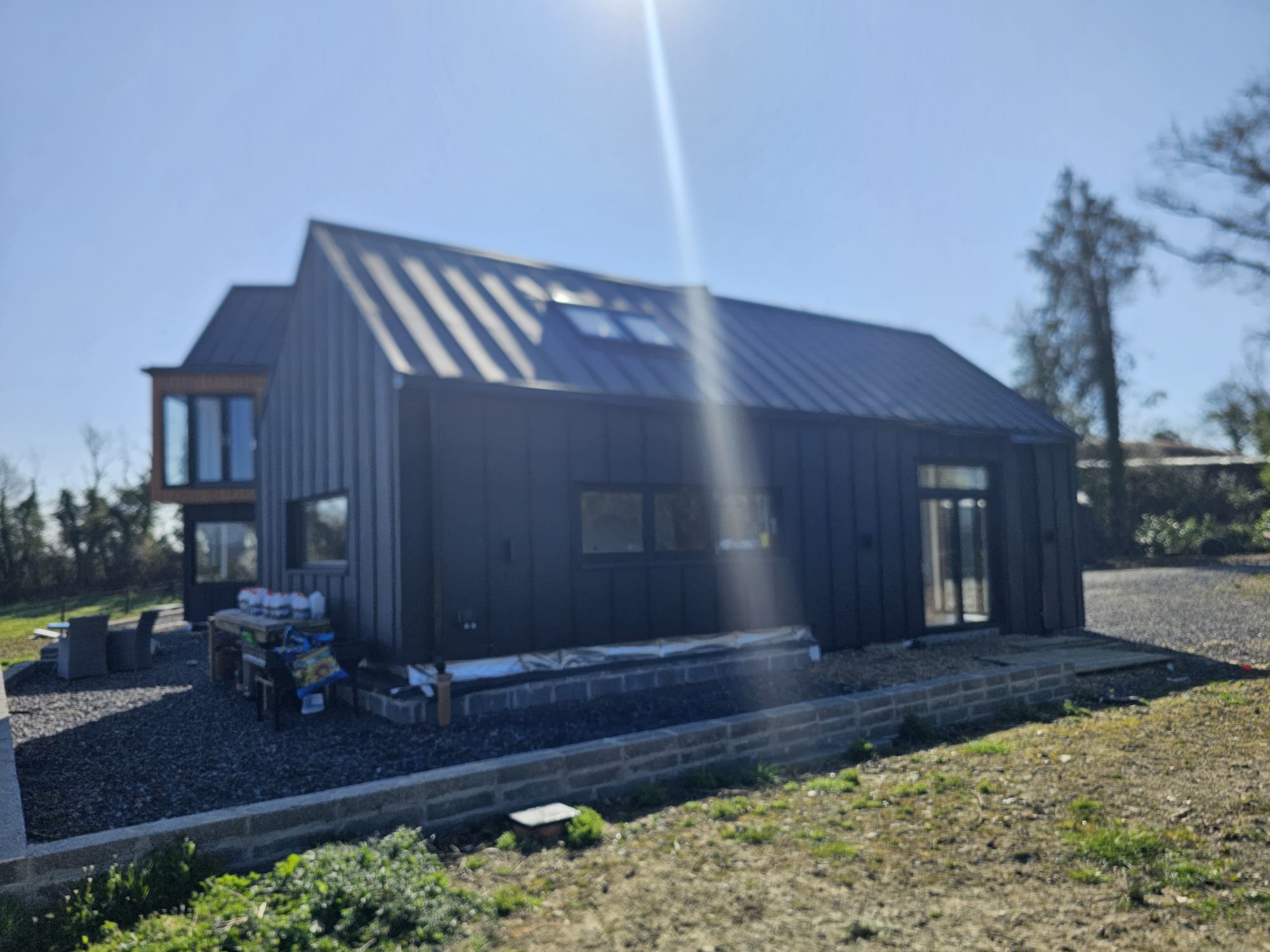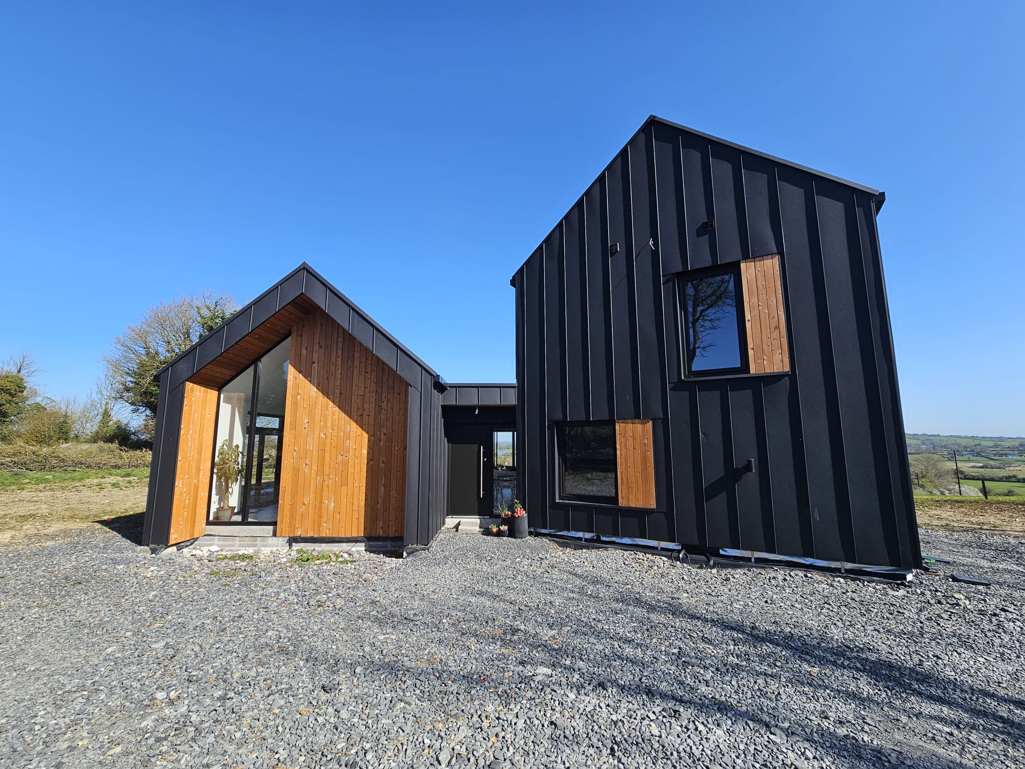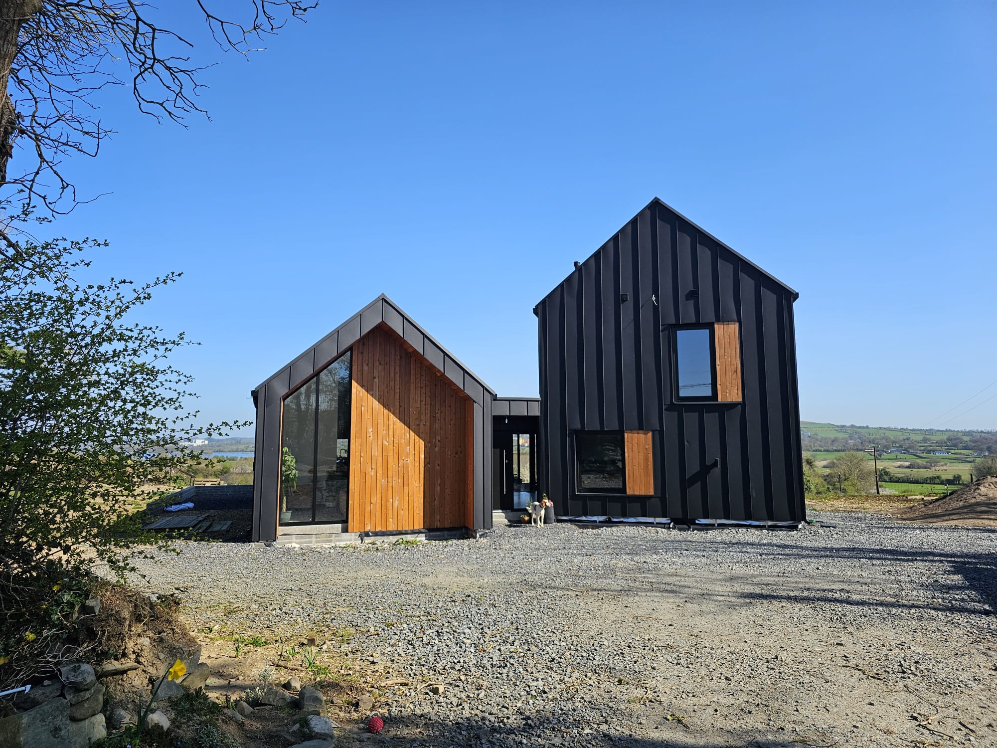 A contemporary new-built dwelling clad in black standing seam metal and larch, overlooking a lake in County Cavan.